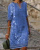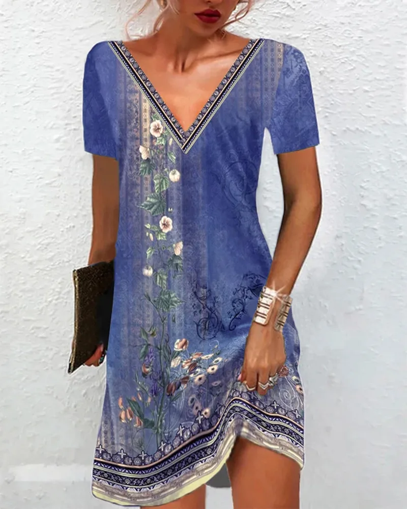 Mini robe à imprimé floral rétro pour femmes, robes d'été décontractées, col en V, demi-manches, élégante robe trapèze, 2023